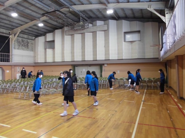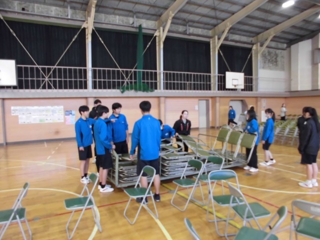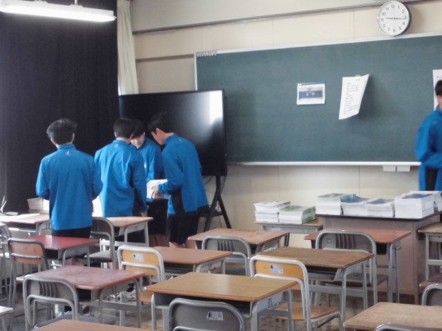 3年生のみなさんが、各教室に教科書の運搬や、明日の入学式・始業式の会場づくりに力を貸してくれています。