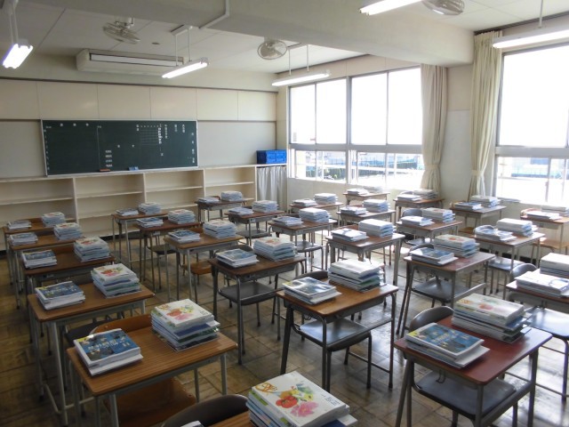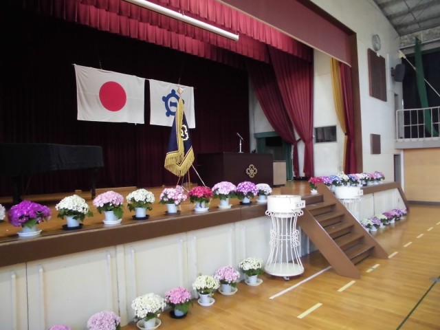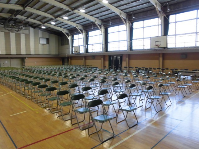 会場の準備がほぼ整いました。体育館のステージには、きれいな鉢植えが並んでいます。フロアには椅子が整然と並んでいます。各教室に目を向けると、すべて揃っているかを確認しやすいように、机の上に教科書類が順番に置かれています。