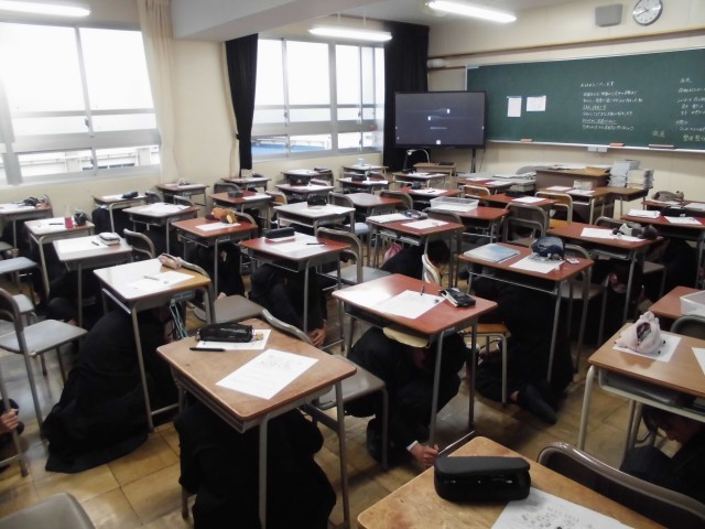 今日の3時間目に、避難訓練とKYT(危険予知トレーニング)の授業を行いました。
