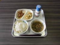 今日は一足早く、卒業お祝い献立です。3年生のリクエスト第2位のハンバーグやお祝いデザートなどが登場します。桜は日本の国花で、昔から桜は春を象徴する花として大切にされています。学校近辺では、まだ桜の花は咲いていませんが、給食のすまし汁に桜のかまぼこを入れて、卒業をお祝いするメニューにしました。3年生は、今日を入れて残り2回の給食です。よく味わって食べてください。