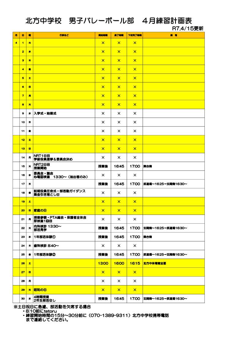男子バレー部、7月の活動予定です。お願いします。 夏休みの部活動予定については、後程改めて出させていただきます。
