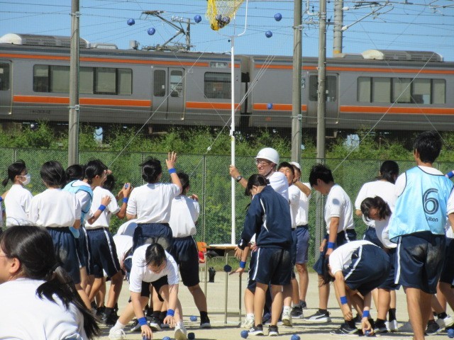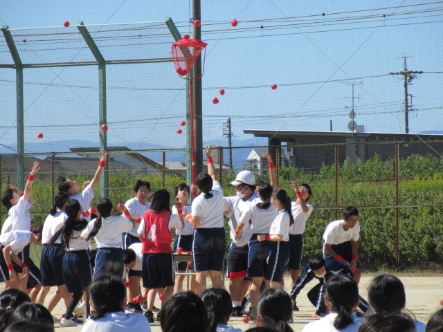 生徒会種目「ボーナスボールを手に入れろ!みんなで玉入れ!」の様子です。全校で楽しめる競技でした。
