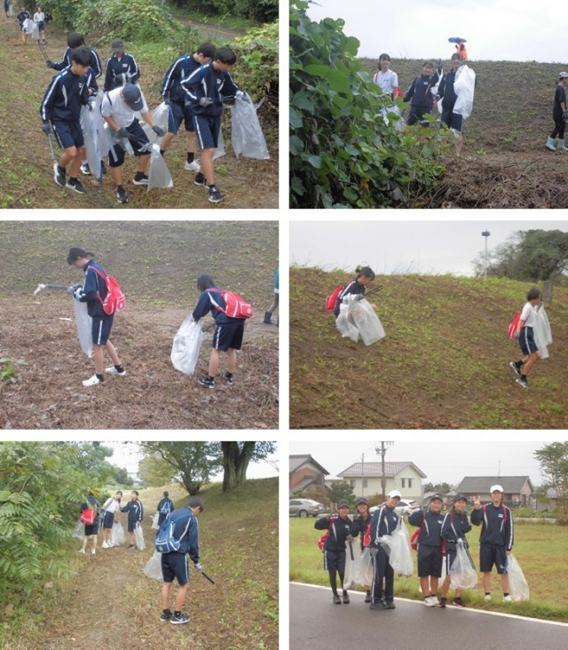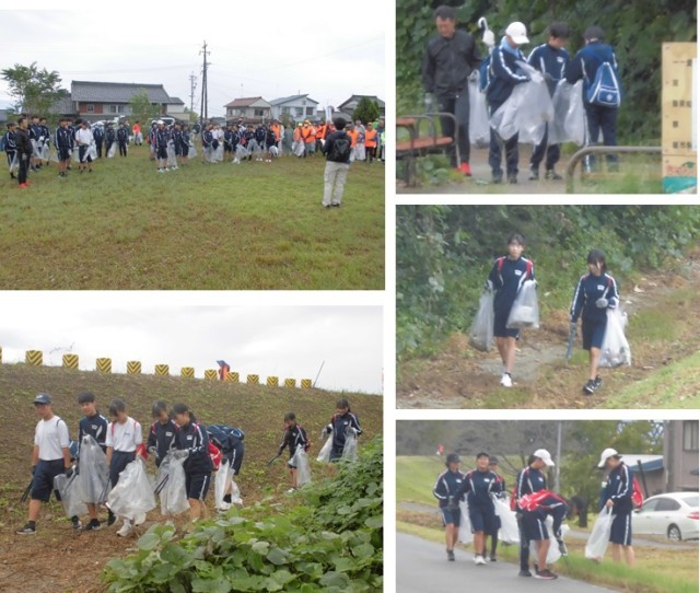 本日の朝,一宮市などが主催する「川と海のクリーン大作戦」が木曽川堤防周辺で行われました。本校から31名の生徒が堤防周辺のごみ拾いにボランティアとして参加し,空き缶やペットボトル,お菓子のパッケージ,たばこの吸い殻などを回収しました。朝早くから気持ちの良い活動ができ,参加した生徒のみなさん,本当におつかれさまでした♪