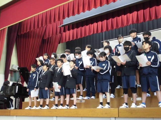 本日,7時間目に歌声コンクールのリハーサルを行いました。お互いのクラスの合唱曲を聞いたり、動きを一通り通したりして、本番に向けて一生懸命練習に励んでいました。