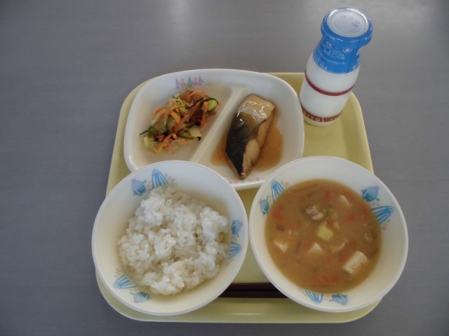10月29日(水) ご飯、牛乳、はまちの照り焼き、つぼ漬和え、さつまいものみそ汁