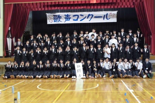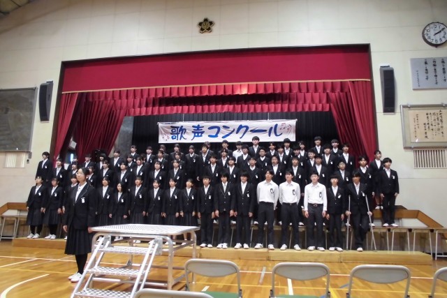 中学校生活最後の歌声コンクールでした。指揮者伴奏者は夏休みから曲に向き合い、クラスや学年のためにたくさん練習をしてくれました。各クラスの練習が始まると、自分たちで声を掛け合いながら練習に向かう姿がありました。練習を重ねるたびに完成度が上がり、学年、クラスの中でも気持ちが上がっていきました。当日を迎え、本番では圧巻の歌声でした。1年生2年生とこれまでに積み重ねた合唱の経験が凝縮された、3年生の「軌跡」を表すような合唱でした。各クラスの曲が終わると、お互いのクラスを讃え合うような様子もあり、温かい雰囲気に包まれました。保護者の皆様におかれましては、お忙しい中お越しいただき、また、本番まで支えていただきありがとうございました。