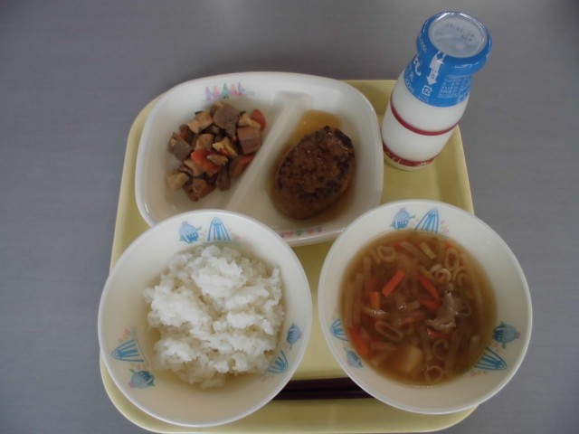 11月13日(木) ご飯、牛乳、のっぺい汁、ハンバーグのおろしがけ、高野豆腐の煮物