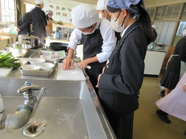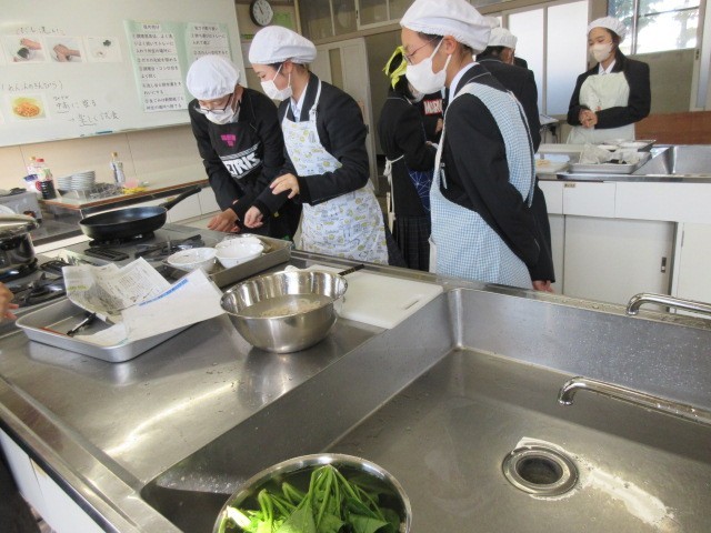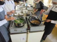 「野菜のおかずをおいしく仕上げよう」という学習のめあてで実習に臨みました。グループ内で担当を分担して手際よく取り組むことができました。