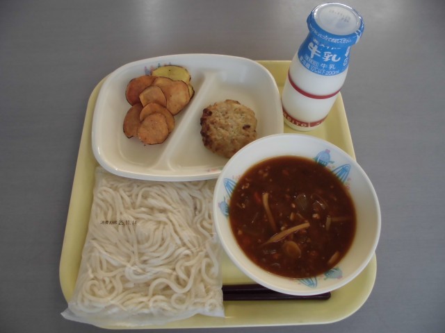 11月14日(金) ソフトめん、牛乳、肉みそソフトめん(汁)、キャベツ入りつくね、さつまいもチップス