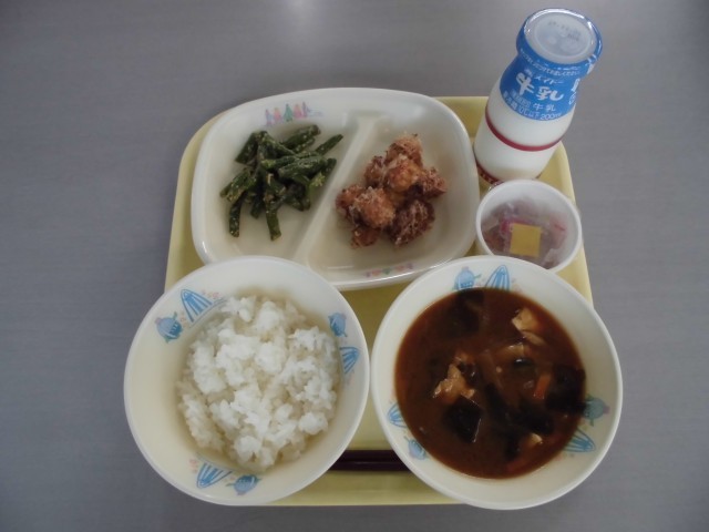 11月25日(火) ご飯、牛乳、たらのおかか揚げ、いんげんのごま和え、ぶた汁、納豆
