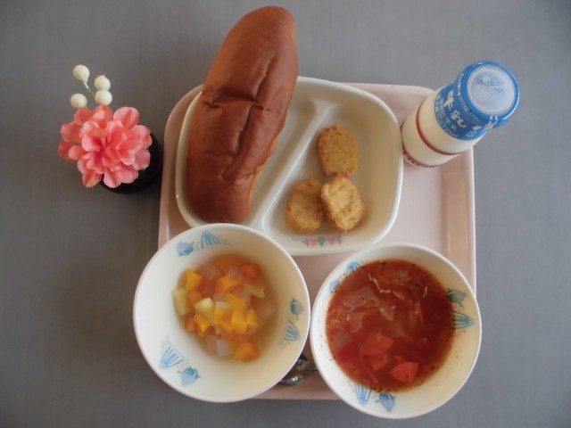 11月26日(水) 黒ロールパン、牛乳、チキンナゲット・3個、みかんゼリー和え、ミネストローネ