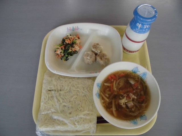12月5日(金) 中華めん、牛乳、五目あんかけラーメン(汁)、ポークシューマイ・3個、チンゲンサイの中華和え
