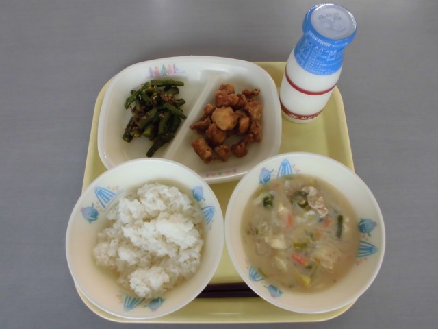 12月8日(月) ご飯、牛乳、とり肉のはちみつじょうゆがらめ、いんげんのおかか和え、一宮野菜の豆乳なべ