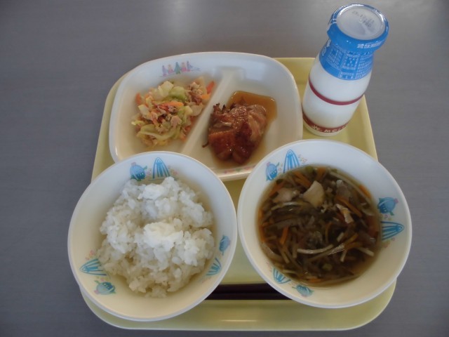 てりどりは給食の中でも大人気の献立です。香ばしく焼き上げたとり肉に、給食特製の甘辛いたれをからめて作ります。ご飯にも良く合う、おいしいおかずでした。沢煮わんも具がたっぷりで食べ応えがありました。