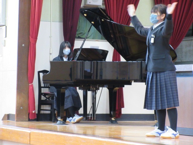 2学期の終業式の校歌の伴奏と指揮を3年生が行いました。特に3年生の声がしっかりと出ていました。