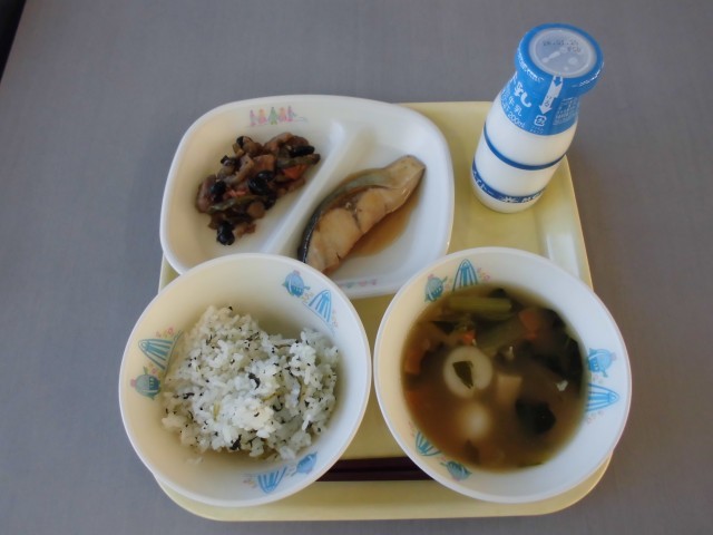 1月9日(金) 愛知のだいこん葉ご飯、牛乳、ぶりの照り焼き、黒豆煮しめ、雑煮