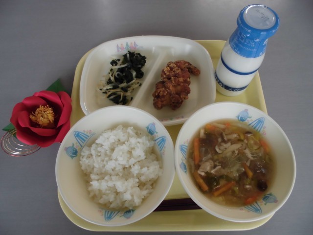 1月13日(火) ご飯、牛乳、とり肉の竜田揚げ、ほうれんそうのおひたし、みぞれ汁