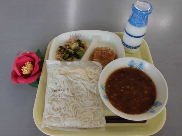1月22日(木) ソフトめん、牛乳、肉みそソフトめん(汁)、豆腐バーグのおろしがけ、花野菜のおかか和え
