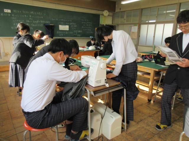 家庭科室で、下衣の制作を行いました。ミシンで股下とウエストを縫う作業に熱心に取り組みました。