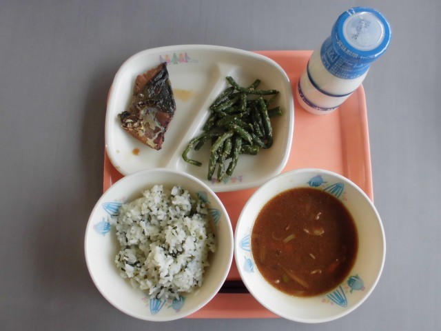 2月13日(金) わかめご飯、牛乳、ぶりのみりん焼き、いんげんのごま和え、ぶた汁