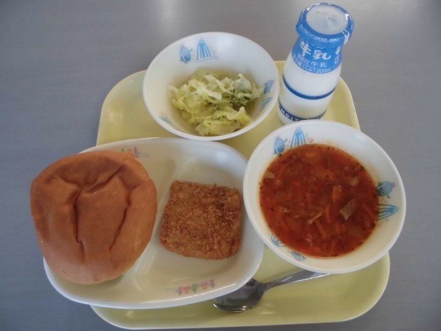 2月18日(水) サンドイッチバンズパン、牛乳、フィッシュフライ・キャベツのタルタルソース和え、ミネストローネスープ