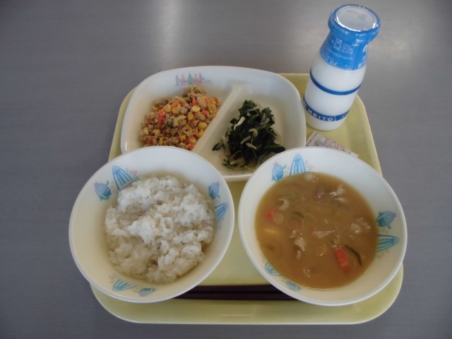 2月20日(金) 麦ご飯、牛乳、そぼろ丼の具、ほうれんそうのおひたし、呉汁、ココアパウダー