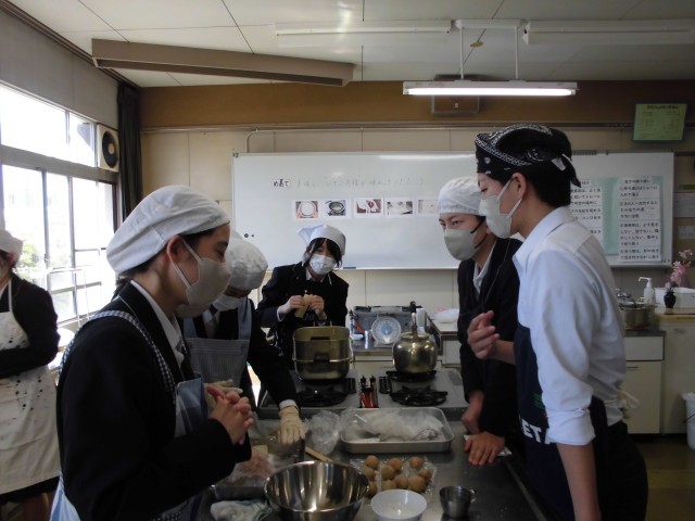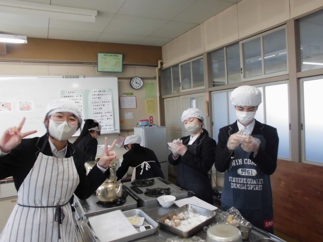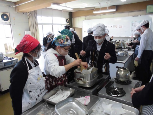 3、4時間目に家庭科で調理実習を行いました。いちご大福と杏仁豆腐を作りました。お世話になった先生方へいちご大福とメッセージを一緒にわたしました。4時間目はみんなで楽しくお茶と手作りおやつで茶話会をしました。この仲間と過ごす時間もあとわずかですね…