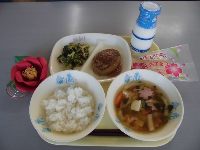 3月5日(木) ご飯、牛乳、ハンバーグのおろしがけ、ブロッコリーのおかか和え、桜のすまし汁、お祝いデザート