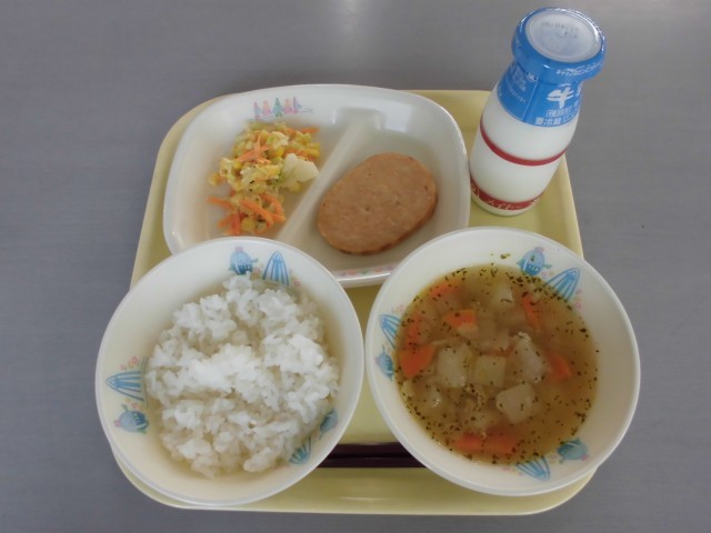 4月14日(火) ご飯、牛乳、ボロニアステーキ、春キャベツのサラダ、かぶのコンソメスープ