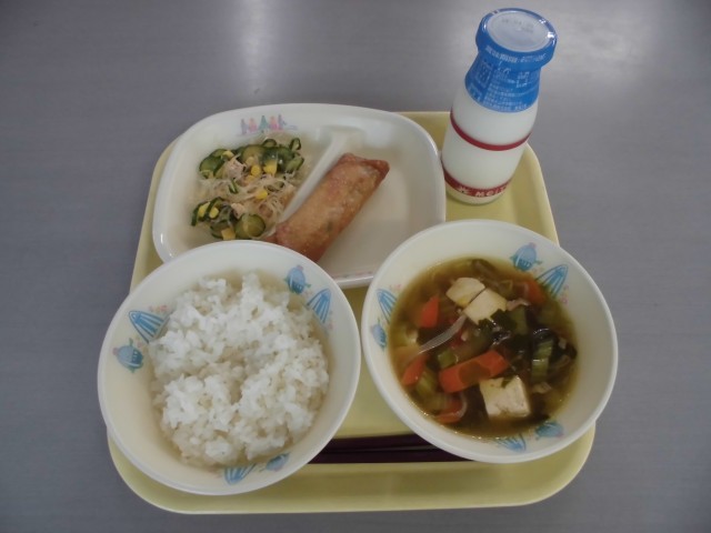 4月15日(水) ご飯、牛乳、春巻、バンサンスー、チンゲンサイと豆腐の中華スープ、