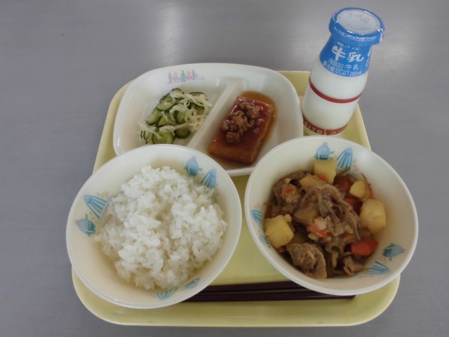 4月21日(火) ご飯、牛乳、厚揚げのそぼろあんかけ、肉じゃが、即席和え