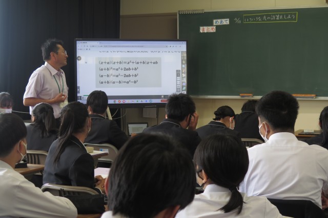 A組は国語の授業で「握手」の朗読を行いました。B組は数学の授業で、展開の公式を用いて様々な式の計算しました。