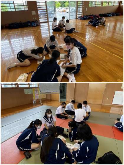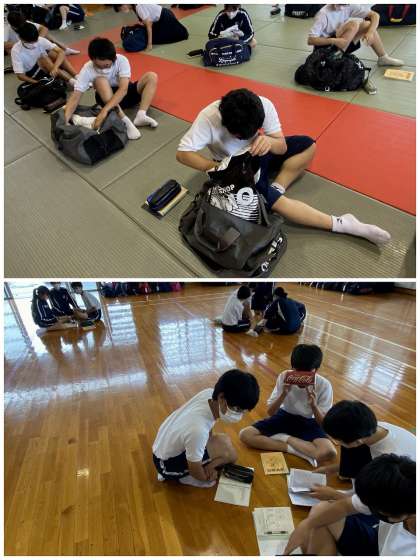 1・2限、修学旅行の事前指導を武道場で行いました。