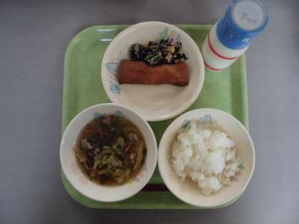 6月16日(木) ご飯、牛乳、中華スープ、愛知のしそ入り春巻、ひじきの中華和え 公開日 2022/06/16 更新日 2022/06/16 給食紹介 今日の春巻には、愛知県産の青じそが入っていました。愛知県の青じその生産は日本一だそうです。さわやかな香りが食欲を増し、さっぱりといただくことができました。また食べたいと思う味でした。