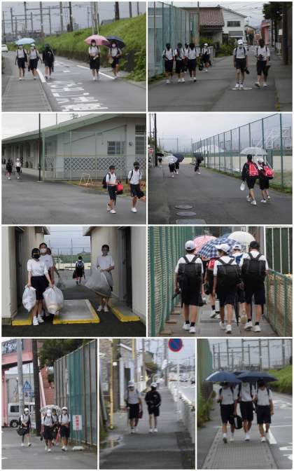 小雨が降る朝になりました。登校時には傘をさしている生徒とさしていない生徒がいました。校内は滑りやすいので、気をつけて生活しましょう。