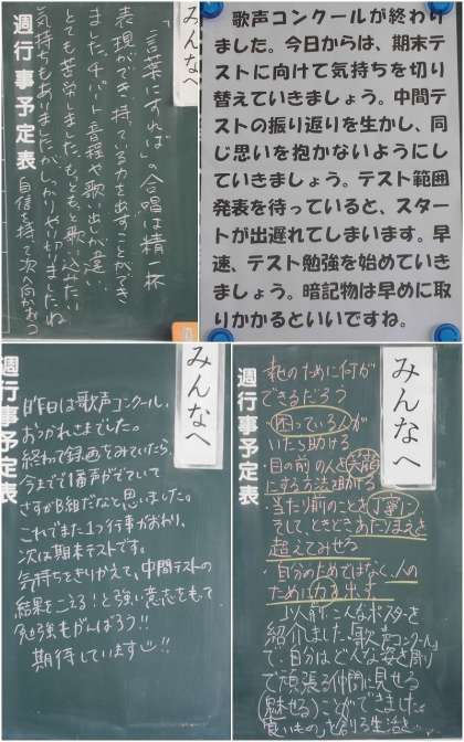 11月8日(火) 黒板メッセージ 公開日 2022/11/08 更新日 2022/11/08 人権教育・いじめ対策 昨日の歌声コンクールでのがんばりを称賛するメッセージに加えて、気持ちを切り替えて次に向かってほしいという願いが書かれていました。