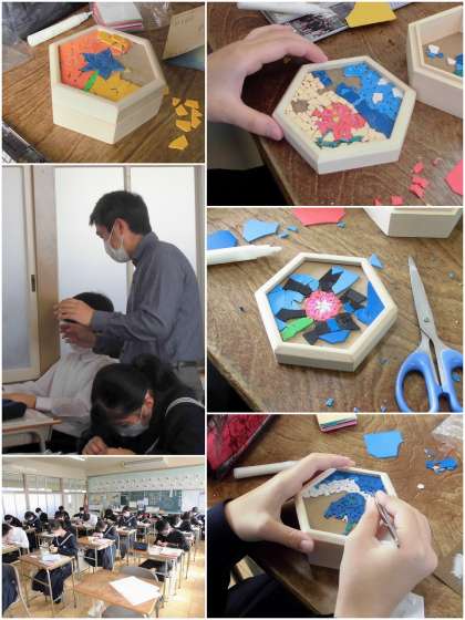 11月10日(木) 根気がいります(3年美術科) 公開日 2022/11/10 更新日 2022/11/10 3年生 3年美術では、モザイクアートにチャレンジしています。 六角形の箱のふたに、薄いタイルを割ってボンドで貼り付けていきます。タイルを割ってから紙やすりで大きさを整えて貼り付けます。細かい作業の連続です。時には床にパーツが飛んで行ってしまい、見つからないこともあります。完成が見えてきました。ここからさらに粘り強くやってください。