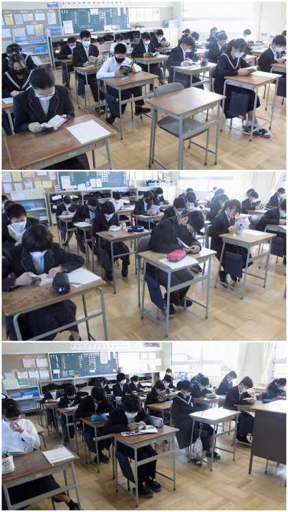 11月14日(月) 読書タイム(1年生) 公開日 2022/11/14 更新日 2022/11/14 1年生 今週はテスト週間になっていますが、清掃後の教室は落ち着いた雰囲気のもと、読書をして過ごせています。授業にも集中していきましょう。