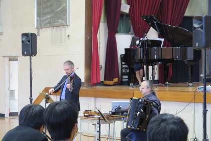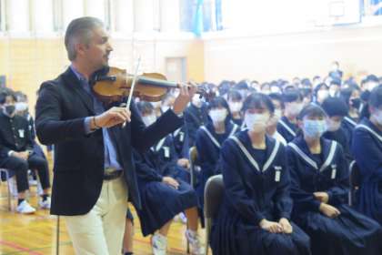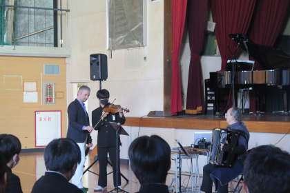 本日、ヴァイオリンとアコーディオンによる演奏会が行われました。生徒たちは間近で見る楽器に興味を持ち、生演奏に感動をし、お二人の話に笑い、考えさせられました。トトさん、アンジェロさん、今日は本当にありがとうございました。テスト後の疲れが癒された素敵な時間でした。