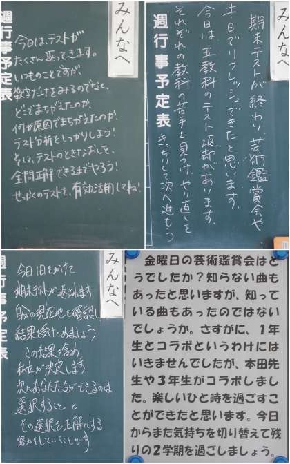 先週の金曜まで行われた期末テストの振り返りを促したり、テスト後の芸術鑑賞会での楽しかった様子を描いたりされていました。担任の先生方のメッセージが頑張るエネルギーになります。