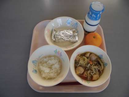 11月21日(月) ご飯、牛乳、ちゃんこ汁、たらの銀紙焼き、みかん