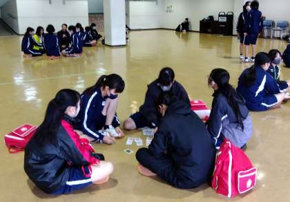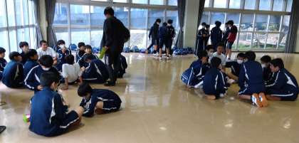 昼食までの待ち時間です。 班で楽しく過ごしています。