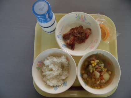 5月9日(火) ご飯、牛乳、チキンのオニオンソースがけ、野菜スープ、オレンジ 公開日 2023/05/09 更新日 2023/05/09 給食紹介 チキンのオニオンソースがけには、香ばしく焼いたとり肉に、炒めた玉ねぎがたっぷり入っていました。玉ねぎは万能野菜で、煮ても焼いてもうま味が増す食材です。味わいながらおいしくいただくことが出来ました。