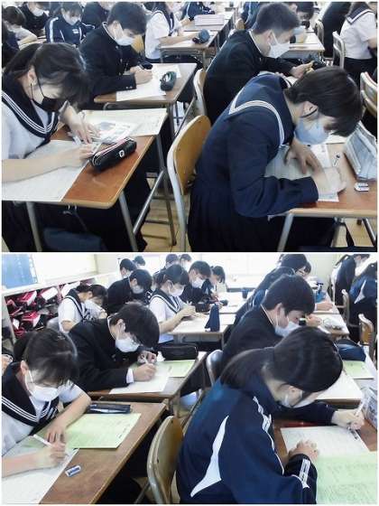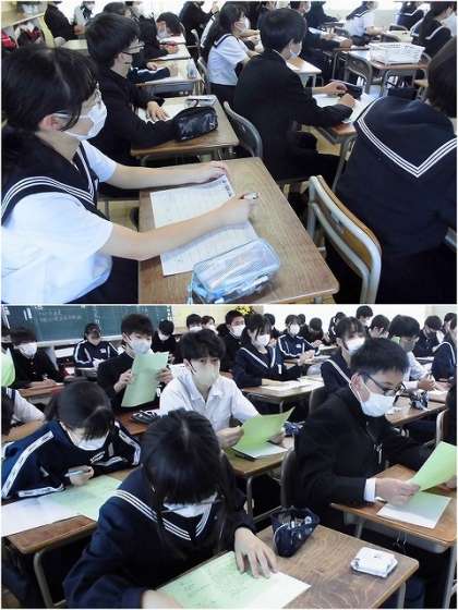 5月11日(木) 中間テスト発表(3年生) 公開日 2023/05/11 更新日 2023/05/11 3年生 清掃後の10分間を使って、中間テスト発表を行いました。 テスト範囲表と計画表が配付され、各自がテストまでの計画を記入しています。3年生になって初めての定期テストで、「やるぞ」という気持ちがあふれています。