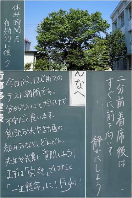 5月11日(木) 黒板メッセージ 公開日 2023/05/11 更新日 2023/05/11 人権教育・いじめ対策 今日は中間テスト発表です。1年生は入学以来、初めての定期テストです。何をどう学習していけばよいのか、分からないことがたくさん出てきます。はじめから上手にテスト勉強はできないかもしれません。自分にあった学習スタイルを見つけていきましょう。