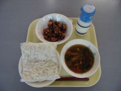 5月11日(木) 白玉うどん、牛乳、山菜うどん(汁)、さけと大豆のごまがらめ 公開日 2023/05/11 更新日 2023/05/11 給食紹介 今日のうどんには山菜がたっぷり入っていました。わらびやぜんまいなどです。山菜には独特の風味があって、一緒に食べるとうま味も増しておいしくなります。味わいながらいただきました。