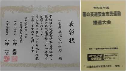 北方中学校はこの1年間交通事故が0であったことを称えていただき、表彰状をいただいてきました。今年も来年もずっと交通事故がない北方中学校にしていきたいです。