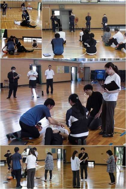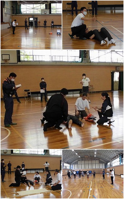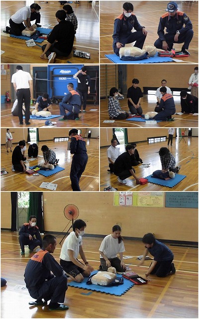 生徒のみなさんが下校した後、屋内運動場で北方消防署の署員さんにおいでいただき、救命救急講習会を行いました。