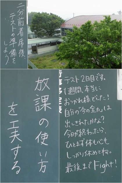 5月18日(金) 黒板メッセージ 公開日 2023/05/19 更新日 2023/05/19 人権教育・いじめ対策 雨が激しく降ってきました。今日で中間テストも終わります。1年生のみなさんは、テスト週間を含めてこの1週間あまり、たいへんだったでしょう。この土日は心もからだもゆっくり休めてください。