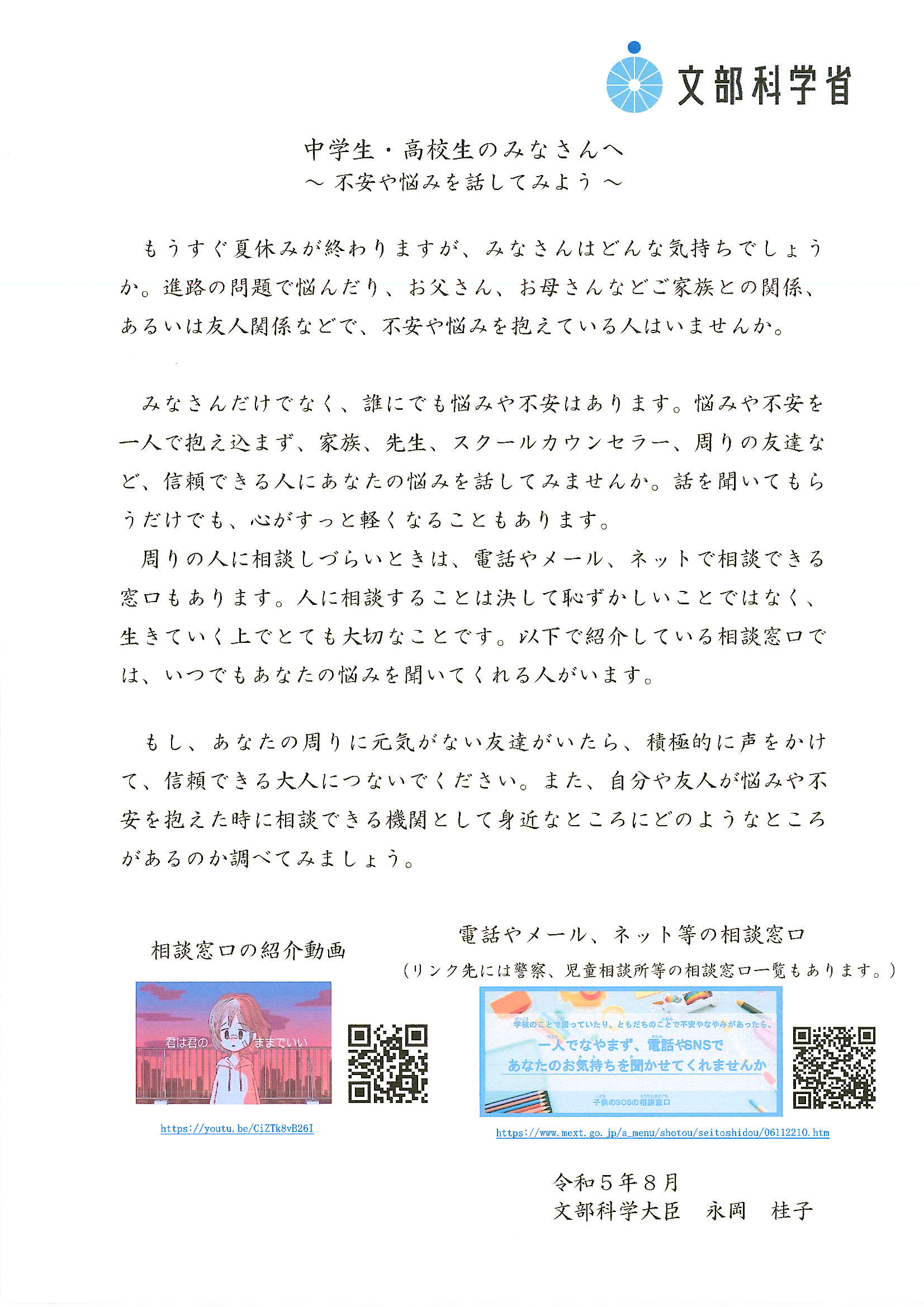 「中学生・高校生のみなさんへ〜 不安や悩みを話してみよう 〜」と題して、文部科学大臣からのメッセージがあります。